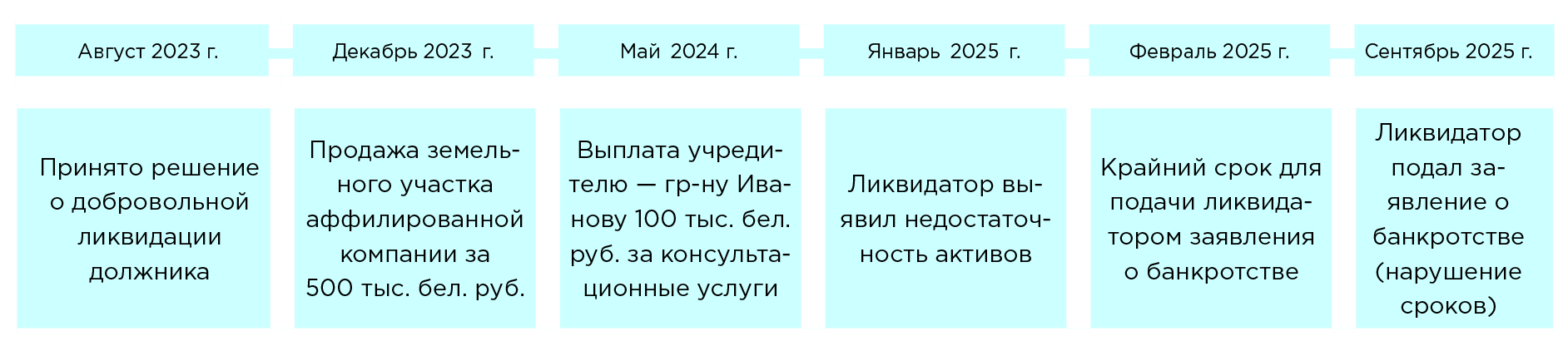 ООО «А» (учредители — гр-н Иванов, гр-н Петров) (далее — должник) в августе 2023 г. начало добровольную ликвидацию. Ликвидатор в январе 2025 г. выявил, что активы должника составляют 1,5 млн бел. руб., а долги — 2,5 млн бел. руб.