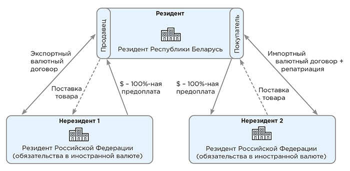 ООО «А» (резидент Республики Беларусь, далее — Резидент) заключило два валютных договора купли-продажи с резидентами Российской Федерации — ООО «Б» (далее — Нерезидент 1) и ООО «В» (далее — Нерезидент 2), в рамках которых Резидент как: