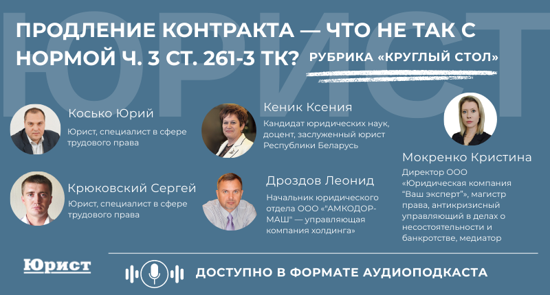 Юрий Косько: Спасибо, коллеги. Мы выяснили главное: продлевать контракт с работником или нет — право нанимателя (если иное не предусмотрено коллективным договором). Но если наниматель желает продлить контракт, необходимо руководствоваться ч. 3 ст. 261-3 ТК, согласно которой контракт следует продлевать на максимальный срок, если работник добросовестен. Все остальное — это риски привлечения к ответственности.